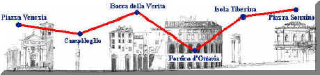 L'interno della chiesa, a 3 navate, contiene opere di grande valore. Attraversata la piazza, ornata da una fontana settecentesca, ci si dirige verso gli antichi templi del Foro Boario. justify