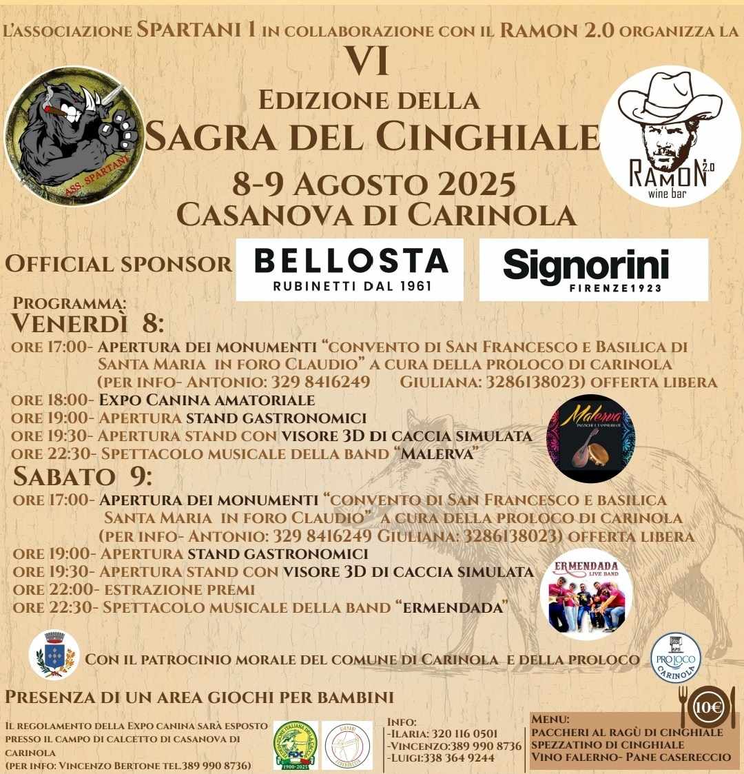 L’8 e 9 agosto 2025 arriva la VI Edizione della Sagra del Cinghiale a Casanova di Carinola, con il patrocinio morale del Comune e della Pro Loco!