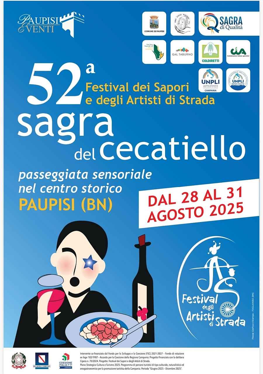 A Paupisi i torna il Festival dei Sapori e degli Artisti di Strada - Sagra del Cecatiello organizzata dalla Pro Loco di Paupisi in collaborazione con il Comune di Paupisi e con il patrocinio della Provincia di Benevento, Parco Regionale Taburno-Camposauro, Gal Taburno, Cia, Coldiretti e Unpli Provinciale.