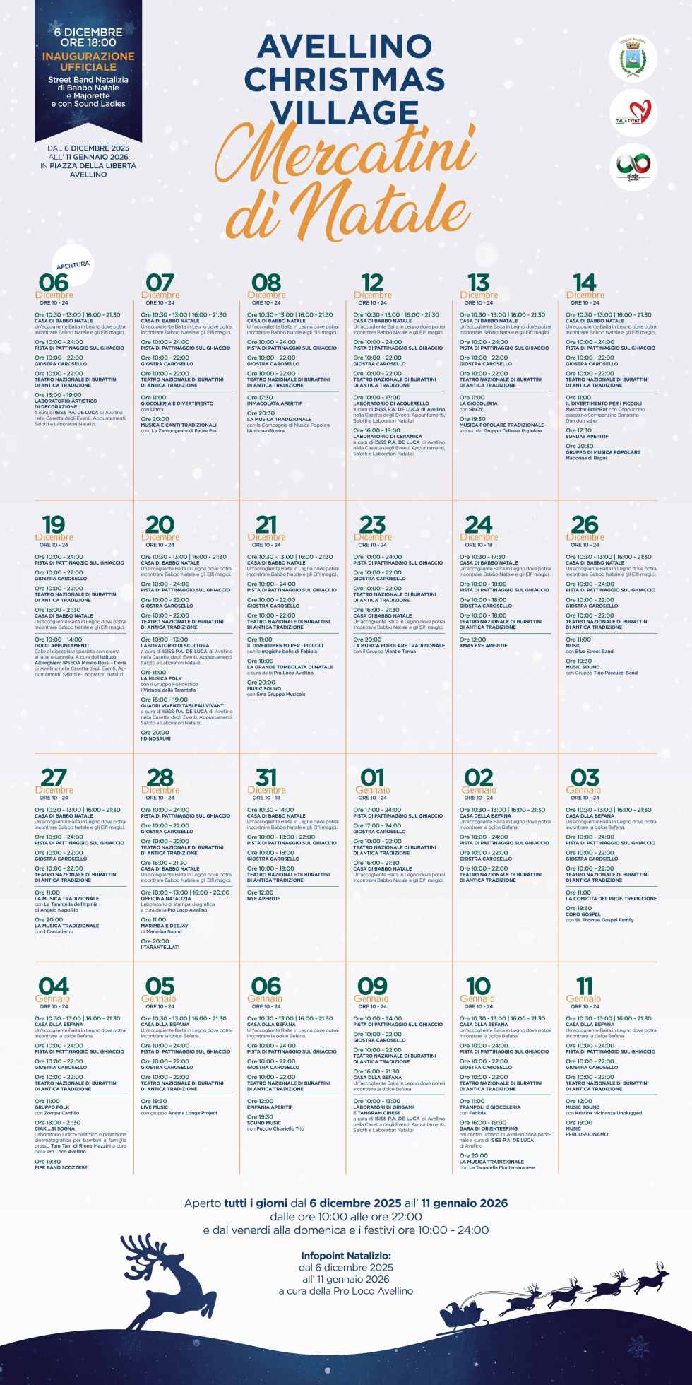 Il progetto, firmato ed organizzato dall’Associazione Italia Eventi, è risultato vincitore di un Bando del Comune di Avellino che ha concesso il suo patrocinio. Il villaggio resterà aperto tutti i giorni dalle ore 10 alle ore 22, nei fine settimana e nei giorni festivi dalle ore 10 a mezzanotte.