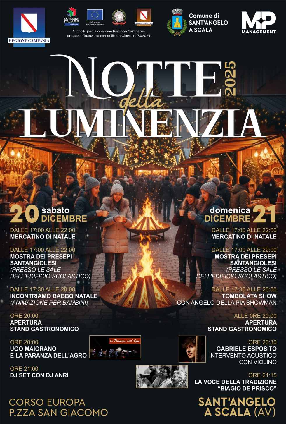Due serate all'insegna del calore dei falò, del divertimento con l'intrattenimento dell'animazione Up&Down Animation e di Angelo Della Pia Showman, i mercatini di natale, le caldarroste e domenica 21 non perderti Gabriele Esposito.