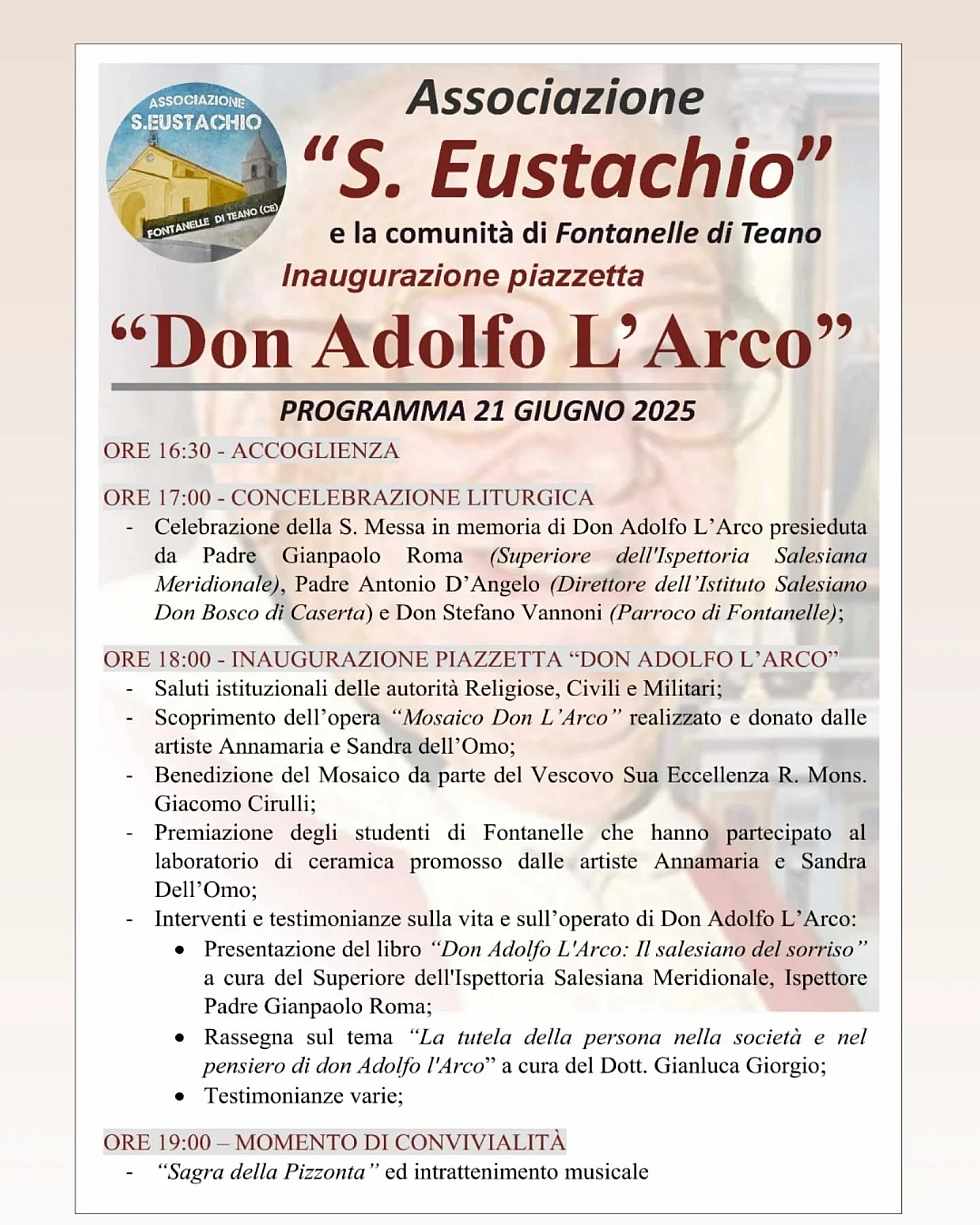 L’Associazione “S. Eustachio” e la comunità di Fontanelle vi invitano all’inaugurazione della "Piazzetta Don L'Arco", in memoria di Don Adolfo L’Arco nato a Fontanelle il 24 maggio 1916 e deceduto a Vico Equense il 25 luglio 2010, sepolto a Caserta nel santuario Sacro Cuore di Maria.