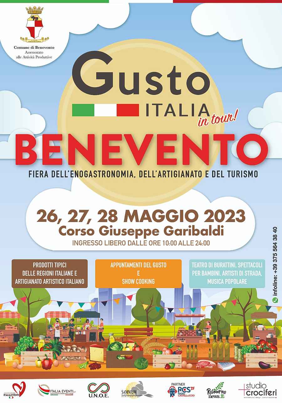 Da venerdì 26 a domenica 28 maggio il tour della fiera dell’enogastronomia, del turismo e dell’artigianato raggiungerà Benevento. Su Corso Giuseppe Garibaldi si posizioneranno gli artigiani e i produttori di Gusto Italia, i quali porteranno con sé le eccellenze e le tipicità di 5 regioni italiane.