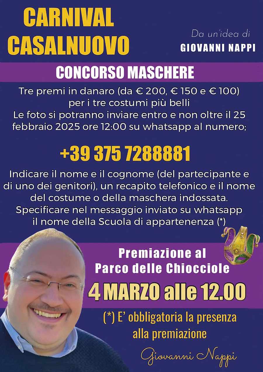 Lunedì 3 e Martedì 4 MARZO: festeggiamo il Carnevale, con animazione, spettacoli e la premiazione dei costumi più belli, al PARCO DELLE CHIOCCIOLE a Via Paolo Borsellino, Casalnuovo (lunedì pomeriggio dalle 17.00 alle 20.30 con il veglione dei piccoli e martedì mattina dalle 10.30 alle 13.30 con festa, animazione e premiazione delle maschere più belle).