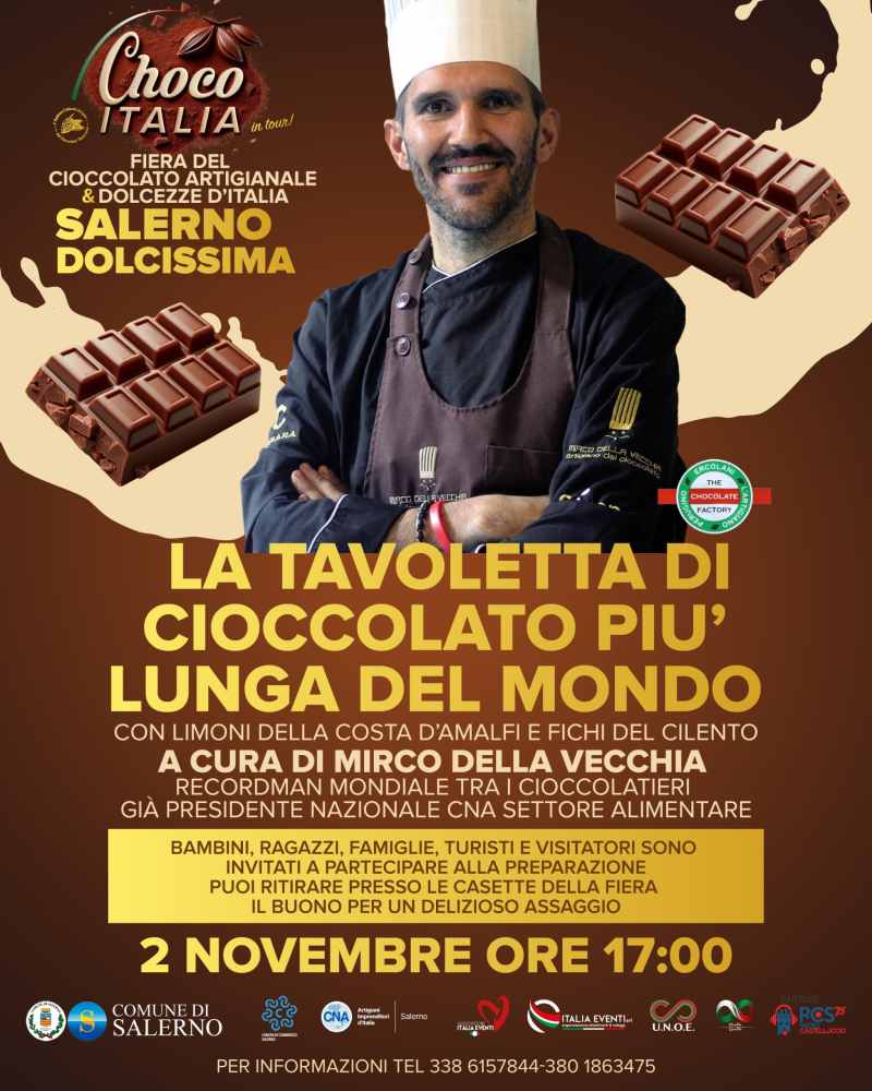 Il prossimo 2 novembre, alle ore 17, il Lungomare di Salerno accoglierà un record dolcissimo. A raggiungerlo sarà il maestro cioccolatiere Mirco Della Vecchia, noto per i suoi numerosi Guinnes World Record, guadagnati realizzando sculture e preparazioni di cioccolato sorprendenti. A coadiuvarlo un altro straordinario artigiano: il perugino Fausto Ercolani.