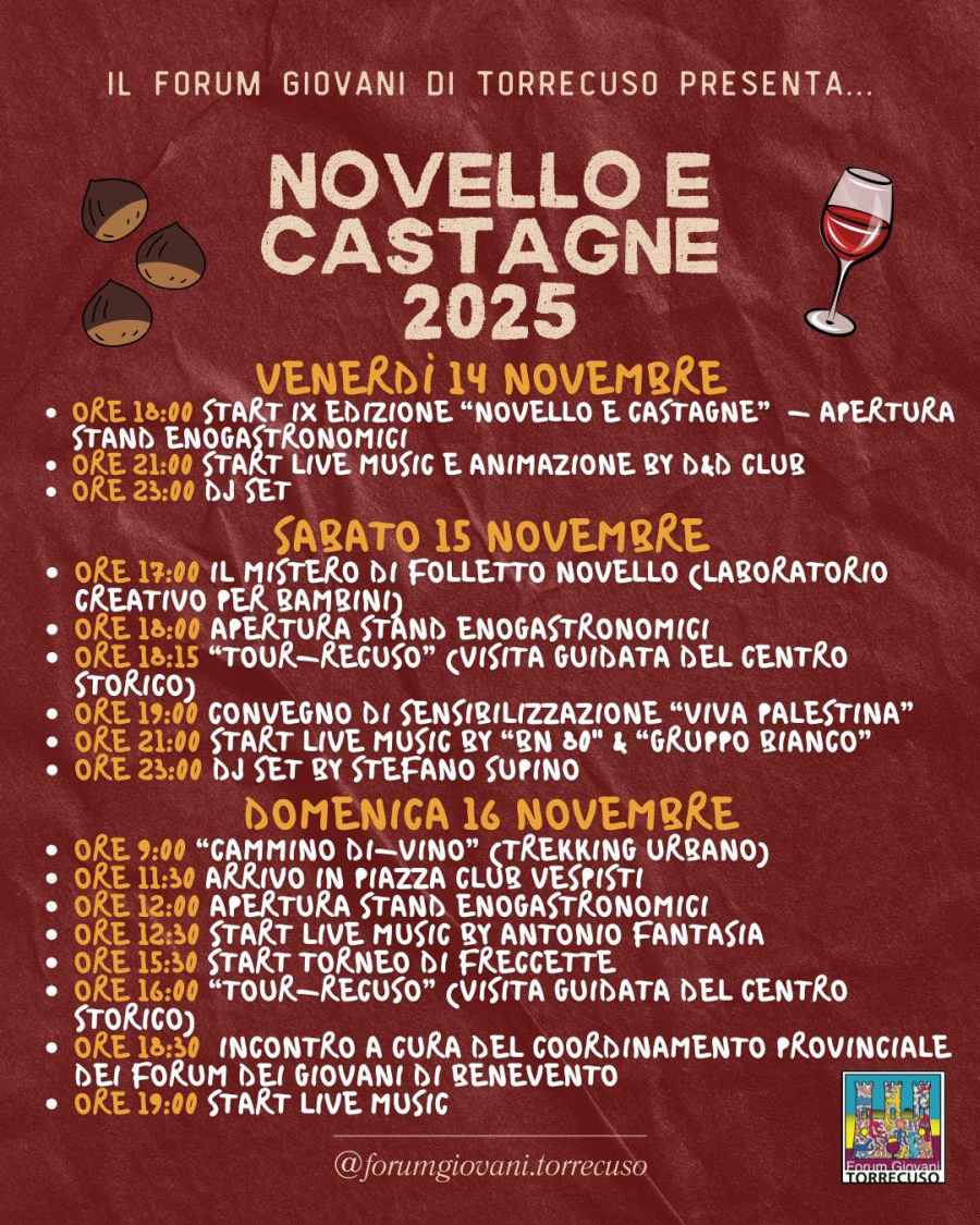 Torrecuso, un borgo affascinante in provincia di Benevento, ogni anno celebra l'arrivo dell'autunno con una festa dedicata a due prodotti simbolo di questa stagione: il vino novello e le castagne. Un evento che unisce tradizione, gusto e convivialità.