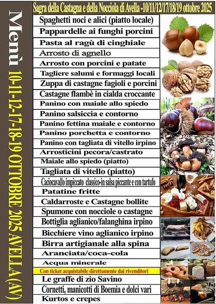 La Sagra che propone la promozione dei prodotti tipici dal territorio Irpino, quali nocciola avellana (nux abellana), castagne dell’Irpinia, noci, olio locale, vini Irpini, cinghiale, origano, funghi ecc., ha avuto già dalla sua prima edizione, l’obiettivo di proporre ai visitatori provenienti da ogni parte del cento-sud dell’Italia, un mix di eccellenze eno-gastromiche irpine abbinate alla cultura ed alla suggestione che ispirano i monumenti storici presenti sul territorio della incantevole Avella Città d’Arte.