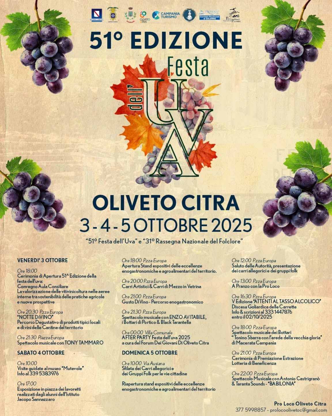 per tre giorni, come da quasi mezzo secolo, la cittadina dell’Alto Sele sarà protagonista e teatro di eventi culturali, enogastronomici e di intrattenimento musicale popolare, di valorizzazione dell’uva e della produzione del vino locale con la realizzazione e le sfilate di carri allegorici, pranzi in vigna, balli, canti, giochi antichi con le botti e la degustazione di prodotti di eccellenza enogastronomica locale.