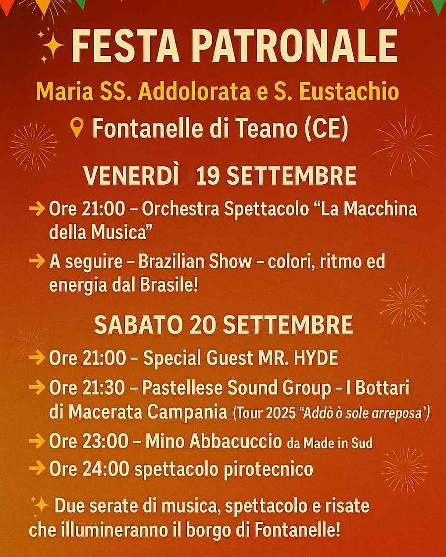 📍 Fontanelle di Teano (CE) si prepara a vivere due giornate indimenticabili per la Festa Patronale in onore di Maria SS. Addolorata e S. Eustachio, il 19 e 20 settembre 2025.