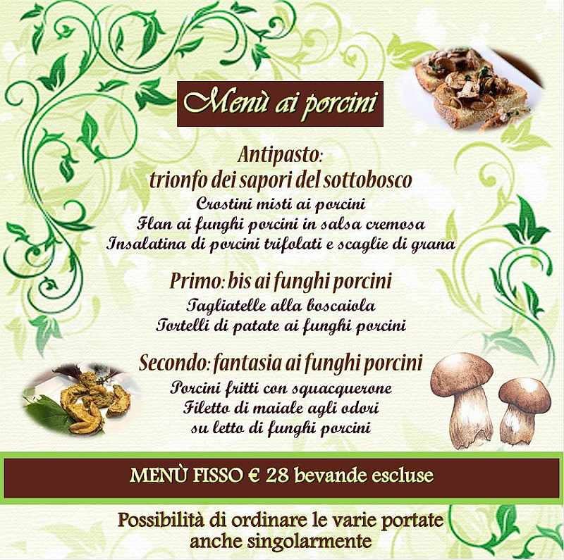 Non manca l’assortimento di antipasti, con crostini misti, flan o insalatina. Per finire degli ottimi secondi piatti, con i ricercati funghi fritti.