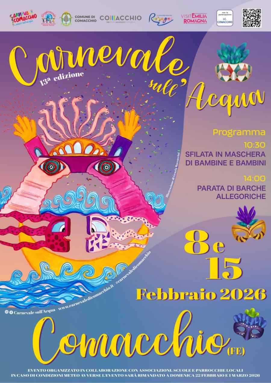 A Comacchio (FE), la "Piccola Venezia", il Carnevale non sfila su strada, ma scivola dolcemente tra i canali. Il Carnevale sull'Acqua è uno degli eventi più spettacolari ed eleganti d'Italia, dove le barche si trasformano in palcoscenici galleggianti.
