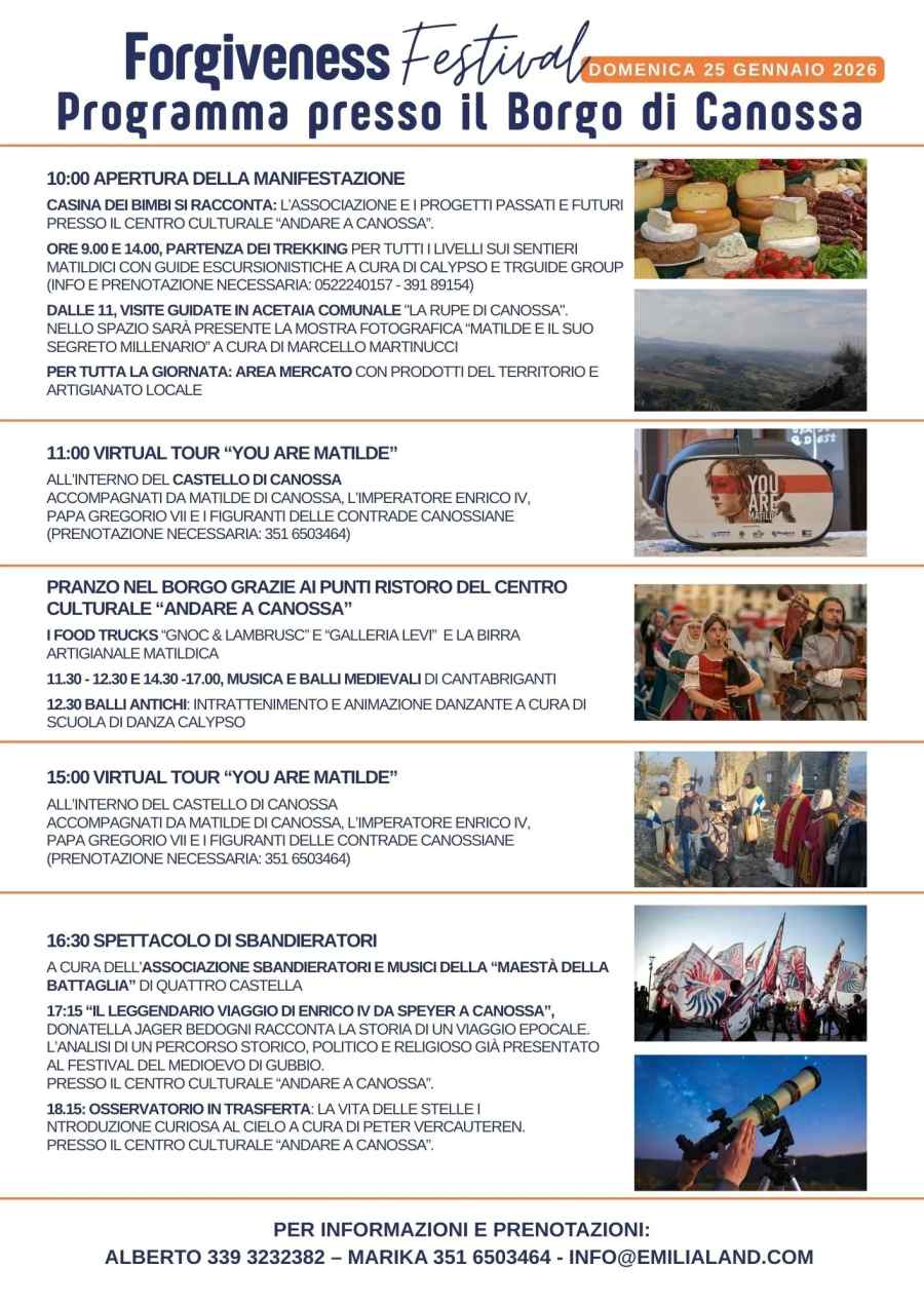 Forgiveness Festival (Festival del Perdono) di Canossa (RE) è un evento carico di significato storico e spirituale, che celebra la figura di Matilde di Canossa e il celebre episodio del 1077, quando l'Imperatore Enrico IV ottenne il perdono di Papa Gregorio VII proprio tra queste rupi.