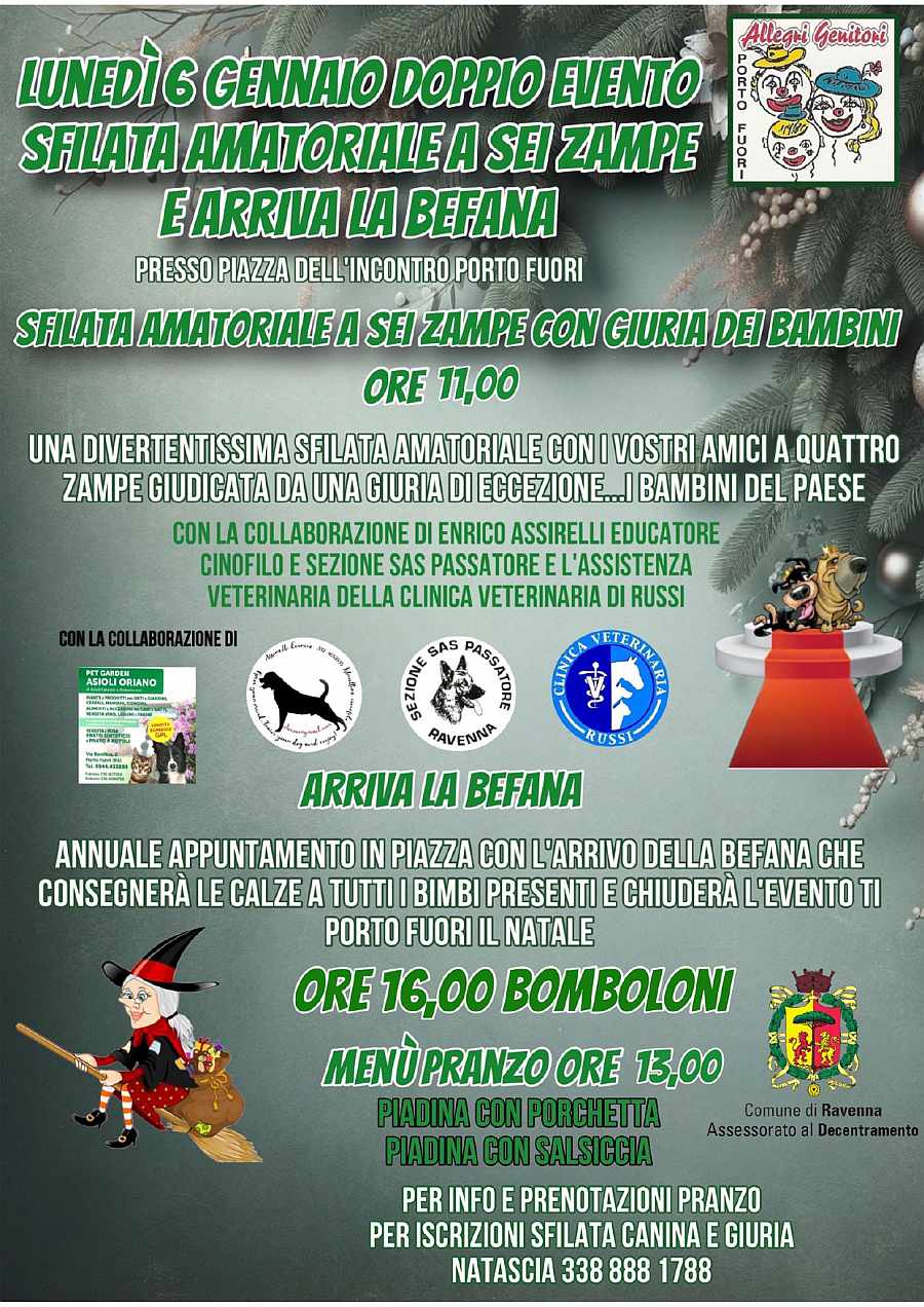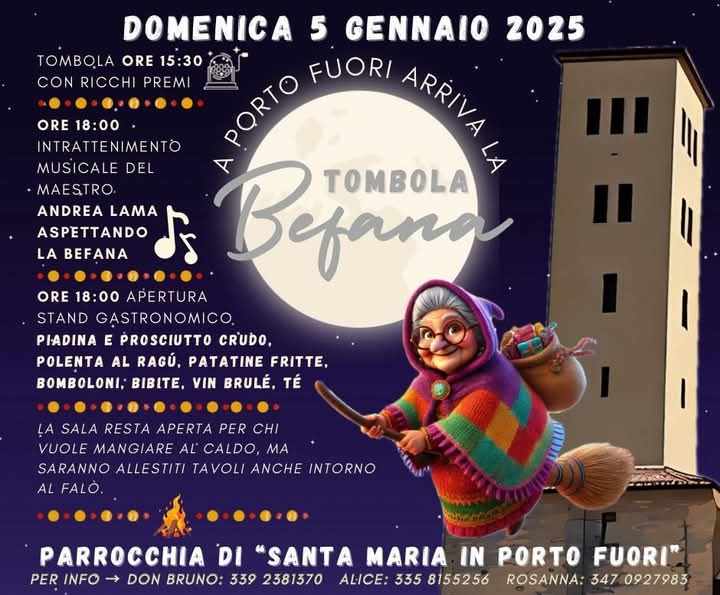 Domenica 5 Gennaio presso la Parrocchia di Santa Maria in Porto dalle 15,30 la Tombola, dalle ore18,00 intrattenimento musicale con Andrea Lama aspettando la Befana e apertura stand Gastronomico.
