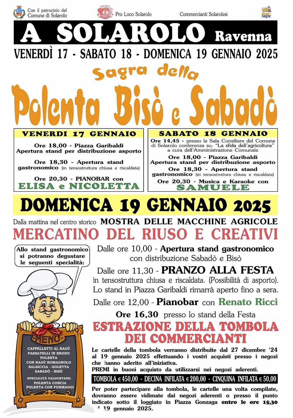 La Sagra della Polenta, del Bisò e Sabadò è un evento che celebra le tradizioni culinarie della Romagna, con particolare attenzione a tre prodotti tipici: la polenta, il bisò (vin brulè) e il sabadò (un dolce a base di pasta sfoglia e mosto cotto).