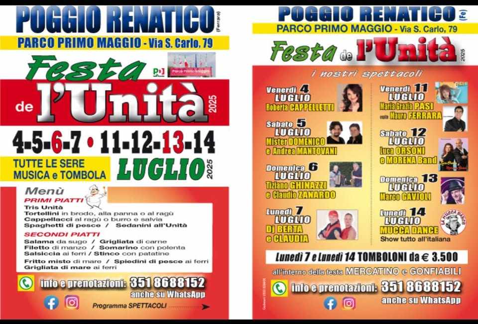 Poggio Renatico (FE) "Festa de l'Unità" 4-5-6-7 / 11-12-13-14 Luglio 2025