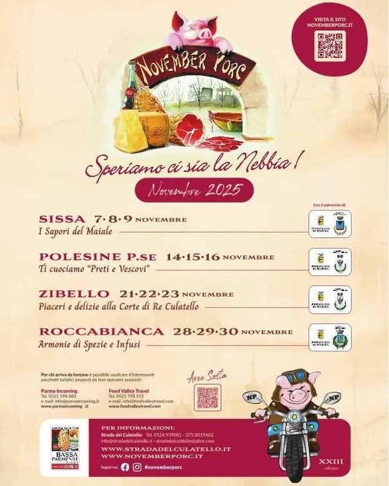 Il November Porc: Speriamo ci sia la nebbia! è l'evento enogastronomico itinerante più goloso d'Italia, una vera e propria staffetta che si svolge nei quattro weekend di novembre nei comuni della Bassa Parmense, cuore della produzione del Culatello.
