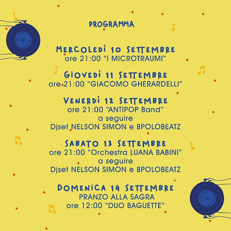 - Sabato 13 settembre (cena): ORCHESTRA LUANA BABINI a seguire DjSet Nelson Simon e Bpolobeatz