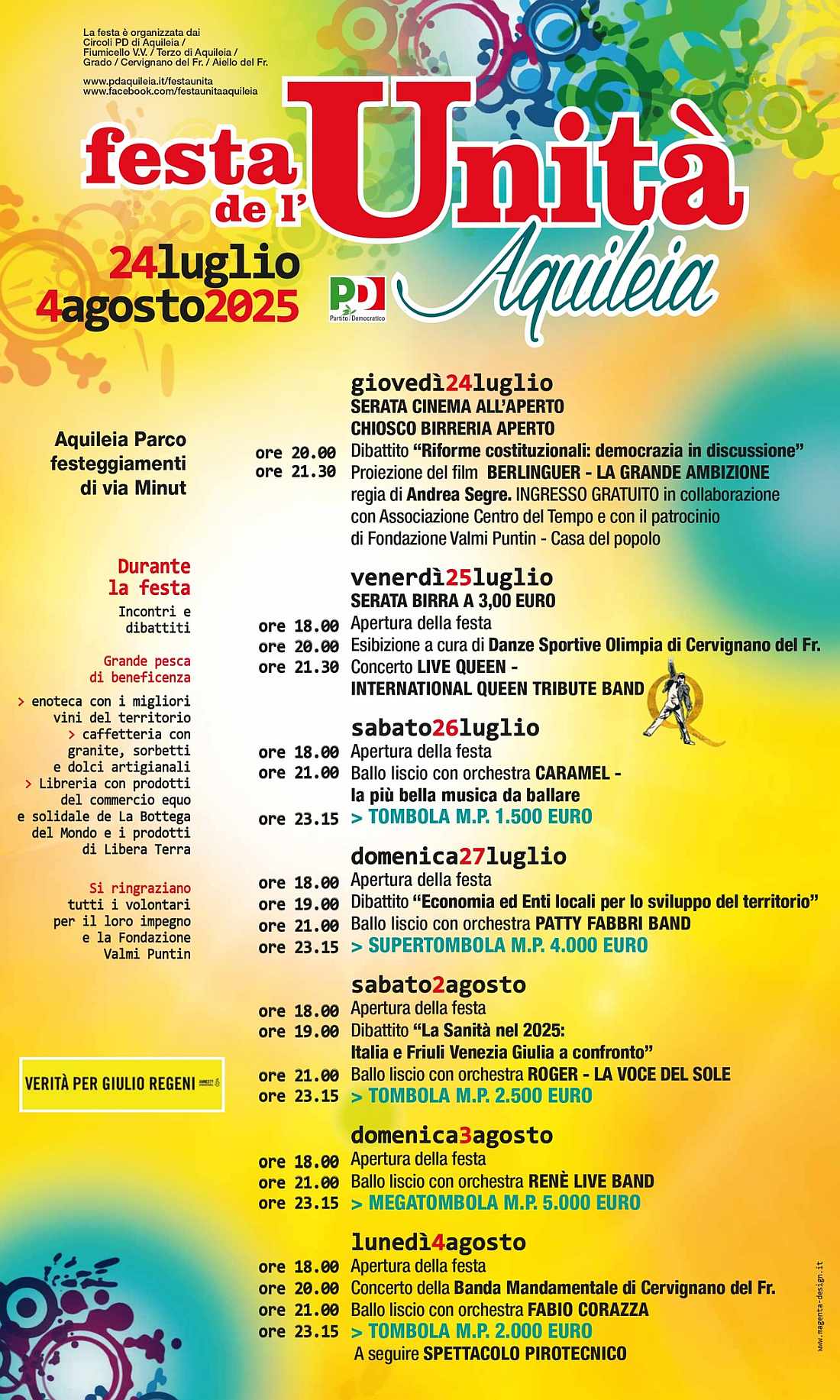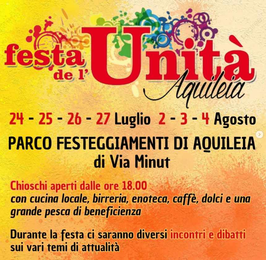 24 - 25 - 26 - 27 LUGLIO e 2 - 3 - 4 AGOSTO Ad AQUILEIA, presso il parco festeggiamenti, FESTA DE L'UNITÀ
