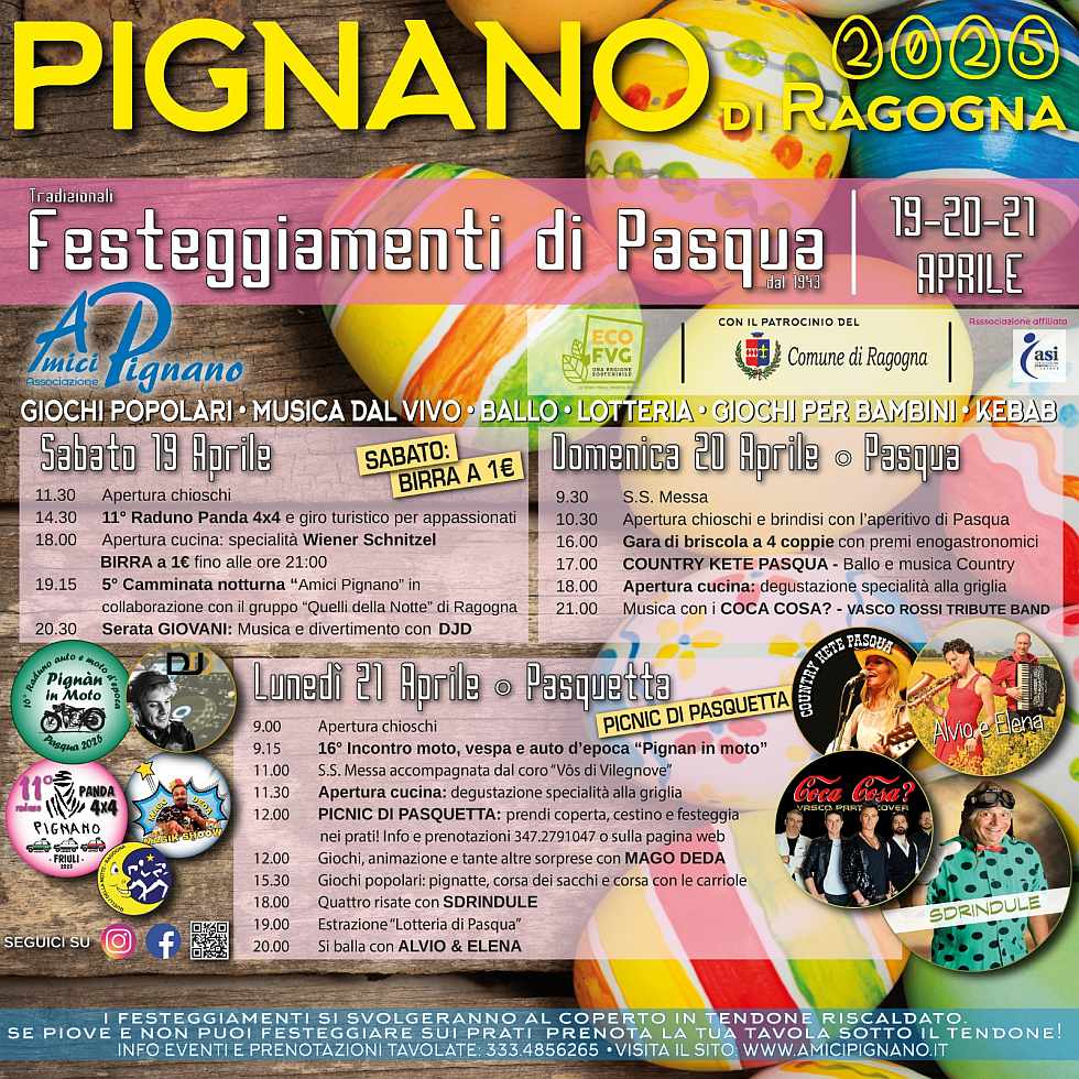 Numerose le attività in programma tra cui: intrattenimenti musicali, giochi popolari e animazione per bambini, tornei di briscola, camminate notturne, la lotteria di Pasqua con ricchi premi gastronomici, l'11° Raduno Panda 4x4, il 16° incontro moto, vespa ed auto d’epoca e il Country KETE PASsQua, un Pomeriggio a tutto Country
