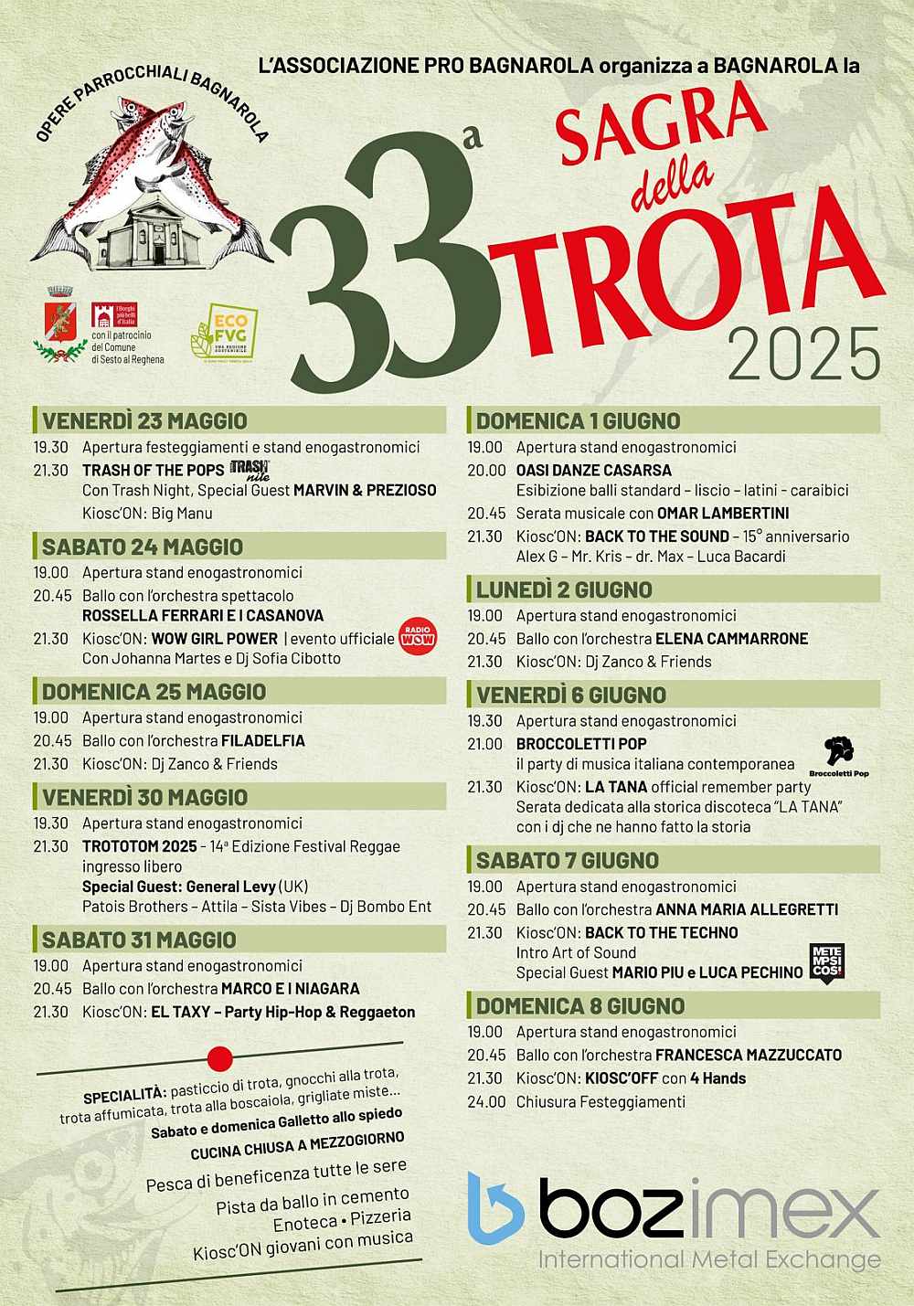 Dal 23 maggio all’8 giugno 2025, torna a Bagnarola l’appuntamento più atteso dell’anno: la Sagra della Trota, giunta alla sua 33ª edizione, organizzata con passione dall’Associazione Pro Bagnarola.