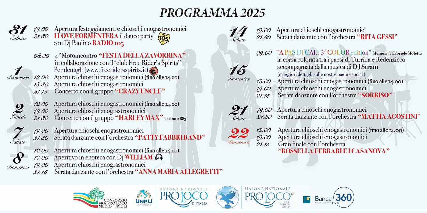 Fornitissimi chioschi enogastronomici con degustazioni tipiche friulane; specialità lumache in umido e alla borgognona, pesca di beneficenza e tanta musica