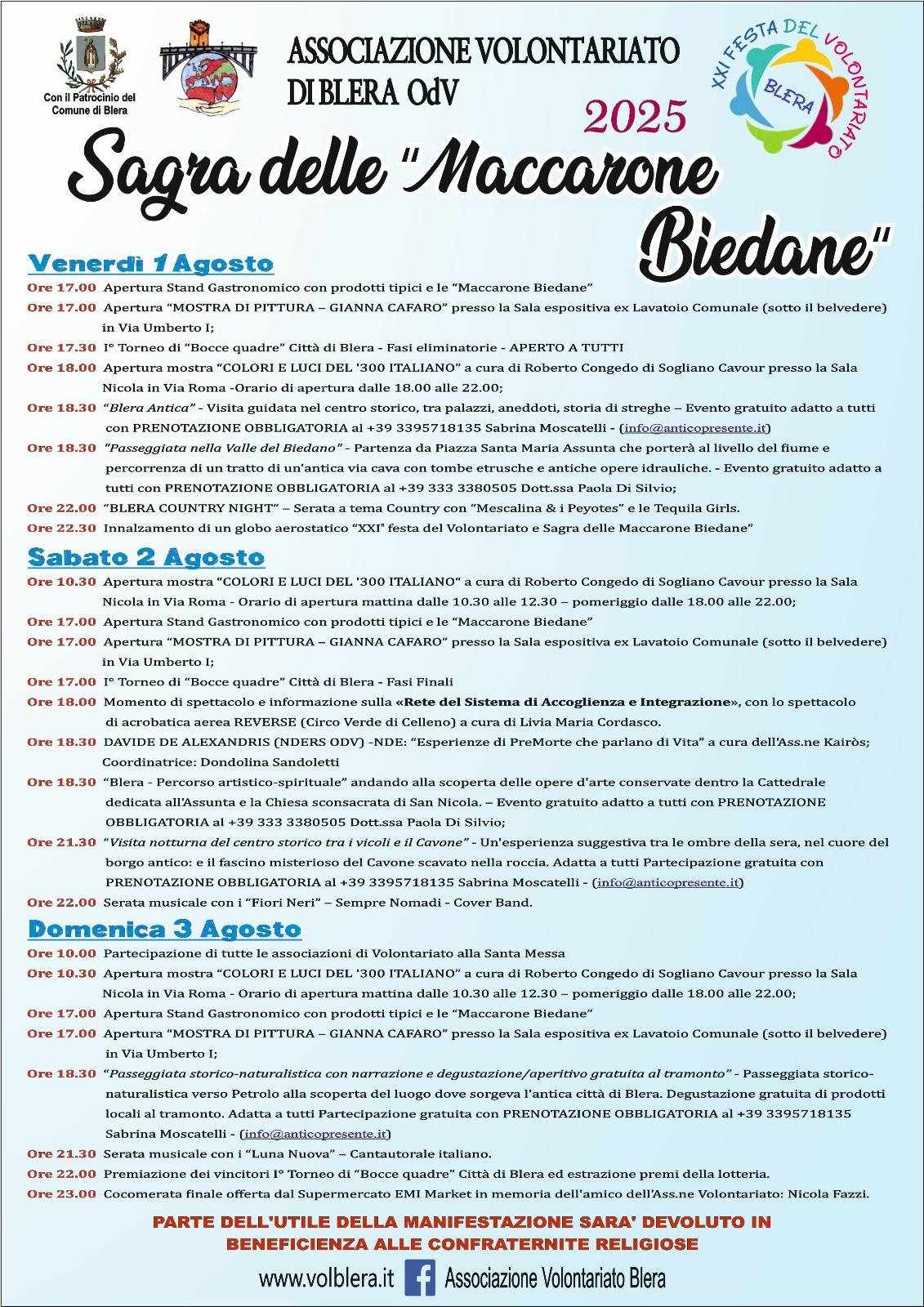 Degustazioni: Il fulcro della sagra è naturalmente la degustazione delle Maccarone Biedane, servite con i tradizionali sughi di pecora e cinghiale, ma anche con sugo al pomodoro. Il menù offre anche altre specialità locali come la pecora alla brace e salsicce.