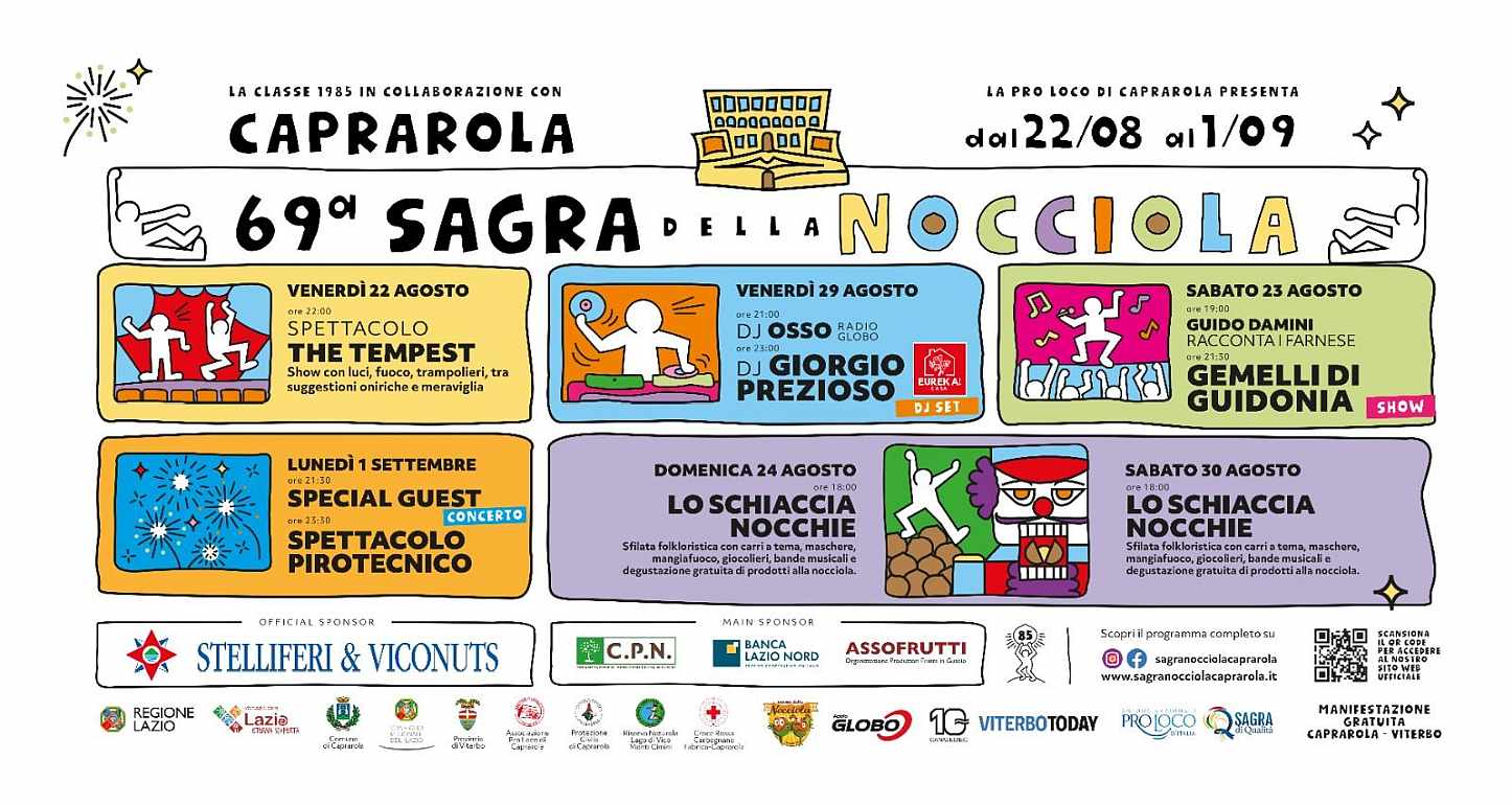 La Sagra della Nocciola è l’evento principale di Caprarola e nasce negli anni 50, diventando l’evento di punta estivo della provincia viterbese, che si svolge nell’ultima settimana di Agosto, attirando migliaia di visitatori.