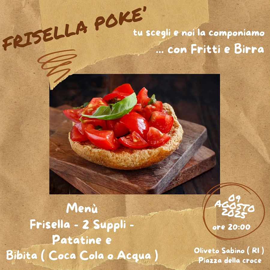 🎉 FRISËLLA POKE 2° edizione – 9 AGOSTO ORE 20:00 Organizzato dal Comitato dei Festeggiamenti di Oliveto Sabino in Piazza della Croce, Oliveto Sabino (RI)