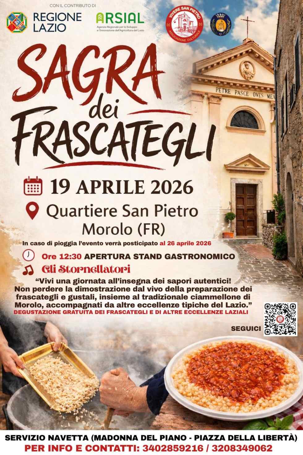 La Sagra dei Frascategli a Morolo (FR) è un appuntamento imperdibile per chi ama i sapori autentici della Ciociaria. Questa manifestazione celebra un piatto povero della tradizione contadina, i "frascategli", ovvero dei piccoli grumi di farina e acqua conditi solitamente con sugo di pomodoro, lardo o verdure, preparati rigorosamente a mano dalle donne del paese seguendo le antiche ricette locali.