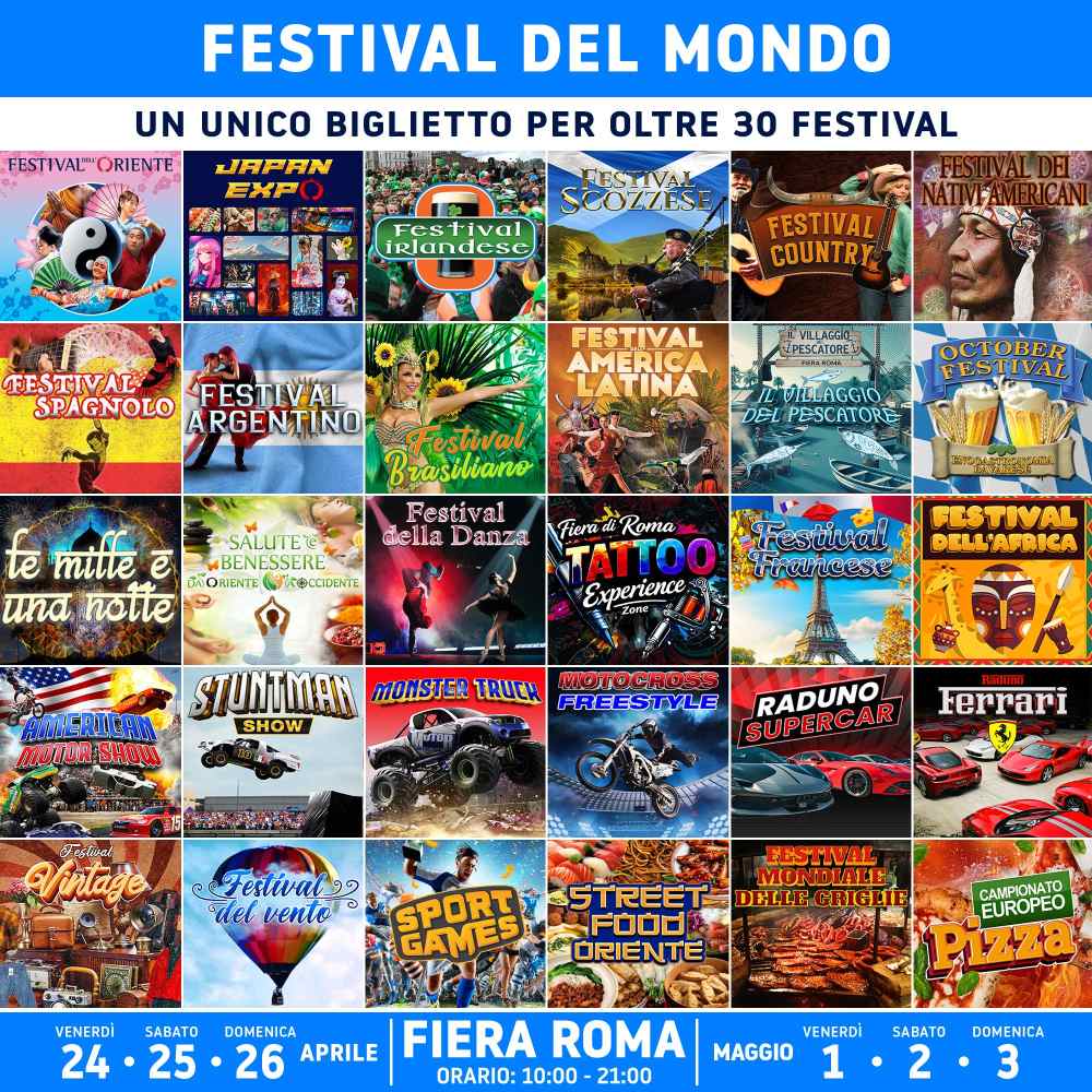 il Festival dell'Oriente 🏮, Expo Japan, il Festival Irlandese ☘️, il Festival Scozzese, il Festival Country, 🤠, Roma Tattoo Experience 🖋️, il Festival dei Nativi Americani, il Festival dell'America Latina, il Festival Argentino, il Festival del Brasile, il Festival Spagnolo💃, il Festival del Giappone ⛩️, il Festival del Portogallo, il Sushi Village 🍣, il Festival della Salute e Benessere, l'American Motor Show con il ritorno del Monster Truck, il Motor Village, 🏎️ Giochi dal Mondo, il Festival degli Artisti da Strada, il Festival delle Arti Marziali 🥋, Sport Games, lo Street World Food Festival, la Sfida delle Grigliate, il Villaggio del Pescatore, il Pizza Festival e tantissimi altri format 🌸