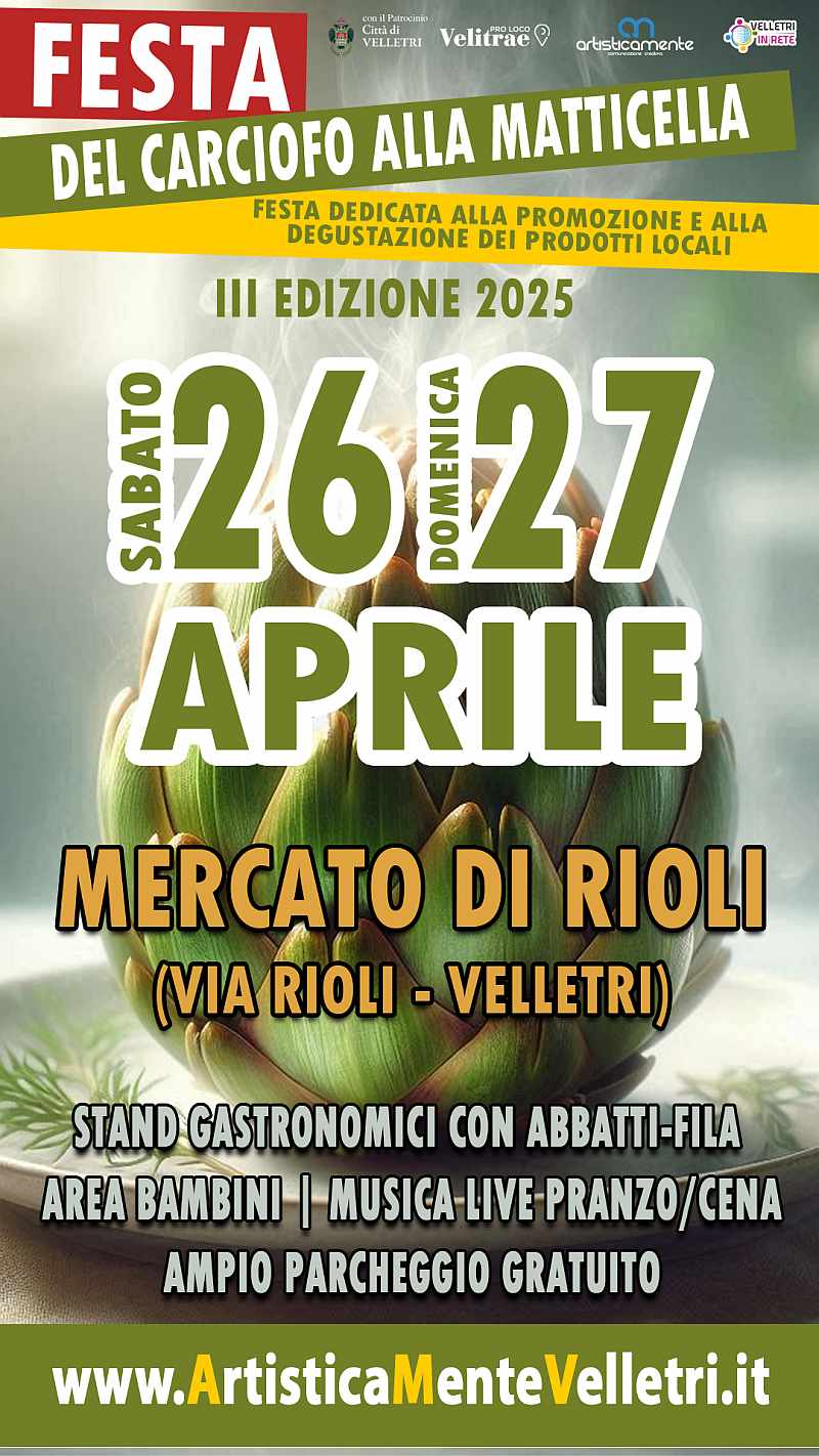 Carciofi romaneschi, (mammole o cimaroli), olio extravergine rigorosamente di frantoio e dell’ultima raccolta, aglio, mentuccia fresca e brace ardente di rami di vite, mani sapienti, questi gli ingredienti di un piatto che ha sapore di antico, una cucina millenaria e una cultura contadina, tramandata da antiche generazioni, che la Pro Loco di Velletri, in collaborazione con l'Ass ArtisticaMente APS con il patrocinio del Comune di Velletri, ripropone nuovamente presso il mercatino di via Rioli, nella campagna veliterna la 3 Edizione 2025.