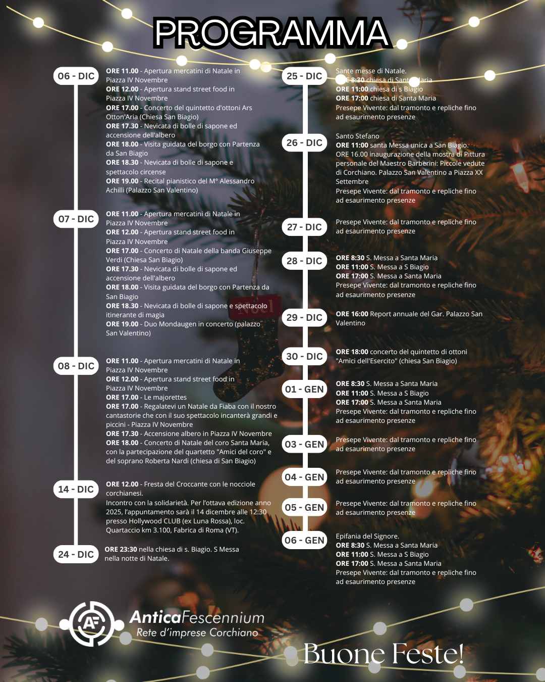 Il calendario completo degli eventi è disponibile sui canali istituzionali del Comune di Corchiano, della Pro Loco e della Rete d’Imprese “Antica Fescennium”. L’Amministrazione invita la cittadinanza e i visitatori a partecipare alle iniziative e a vivere l’atmosfera unica che Corchiano offre durante il periodo natalizio.