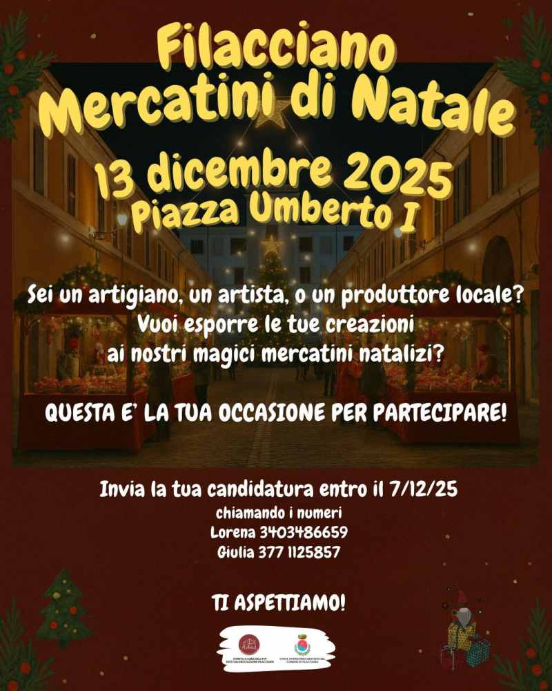 L’EVF – Ente Valorizzazione Filacciano sta selezionando artigiani, creativi, produttori e realtà locali per un mercatino natalizio unico, nel cuore del paese.