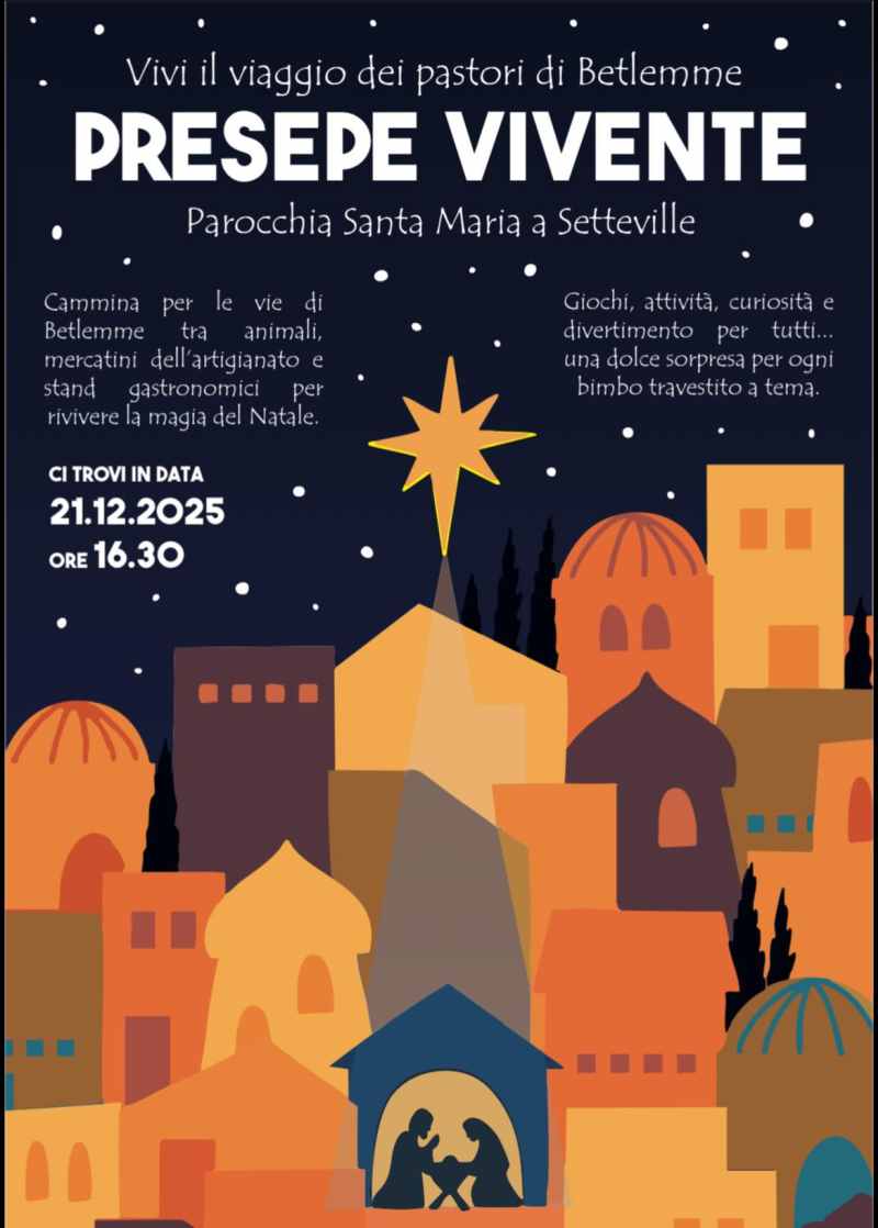 Torna la magia del Presepe Vivente a Setteville, in via Muratori, presso gli spazi circostanti la Parrocchia di Santa Maria a Setteville, il 21 Dicembre dalle ore 16:30.
