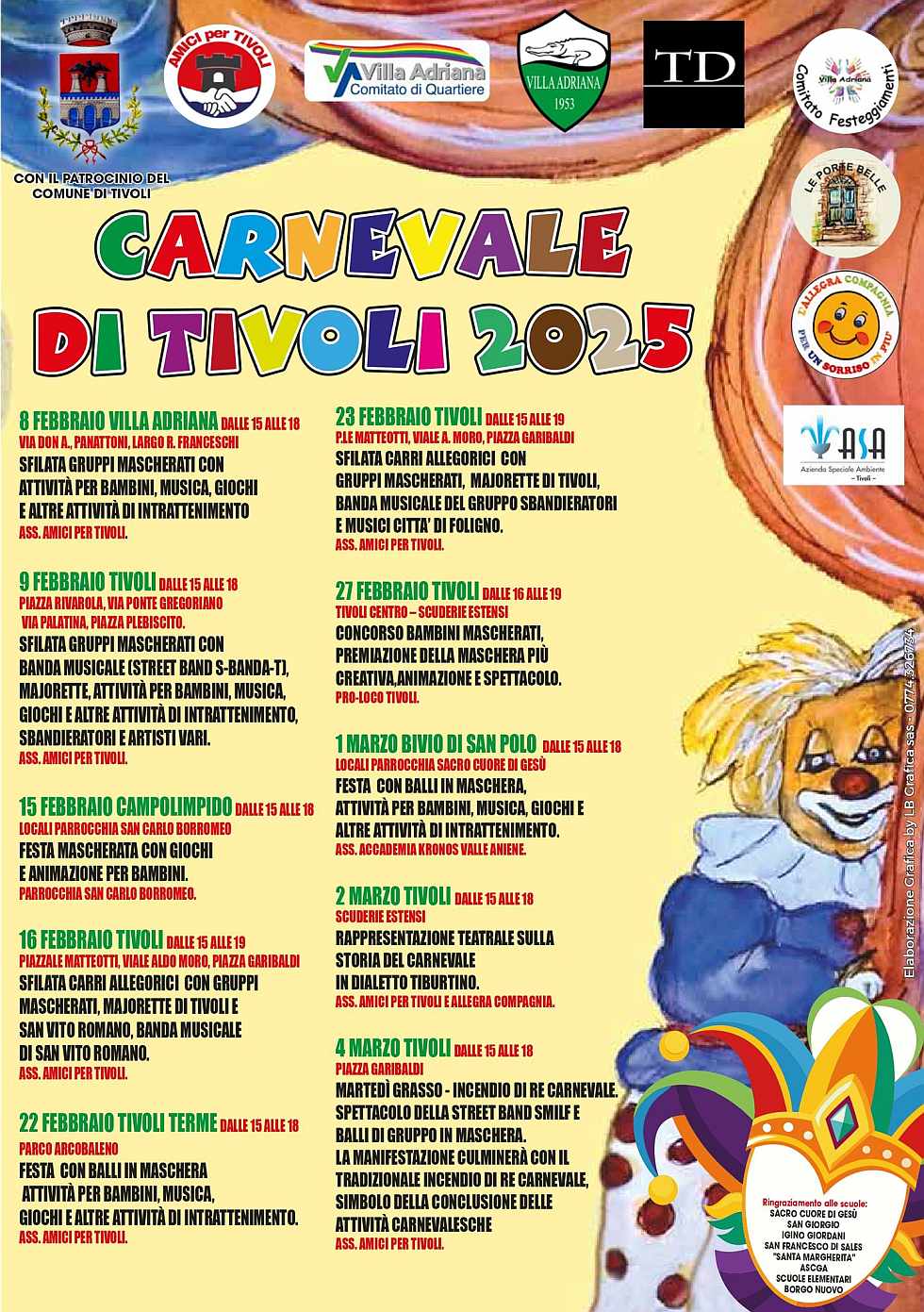 Il programma del Carnevale di Tivoli 2025 prevede sfilate di carri allegorici, gruppi mascherati, musica, spettacoli e degustazioni di prodotti tipici locali.
