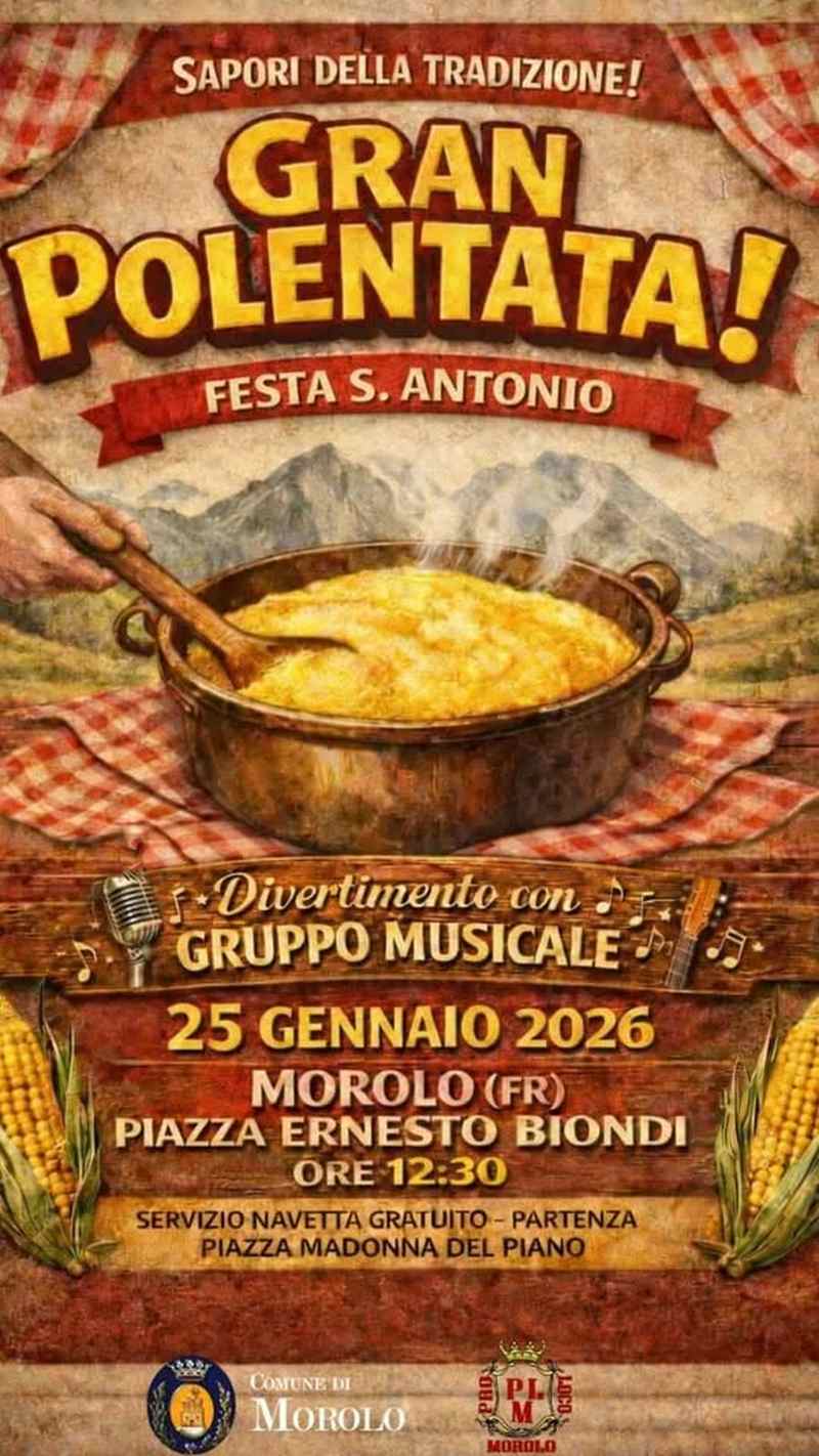La Pro Loco di Morolo invita cittadini e visitatori alla tradizionale Polentata di Sant’Antonio, un appuntamento che celebra i sapori della tradizione e lo stare insieme.