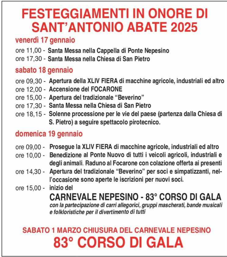 Il Carnevale Nepesino è un evento che si tiene in concomitanza con la festa di Sant’Antonio Abate.