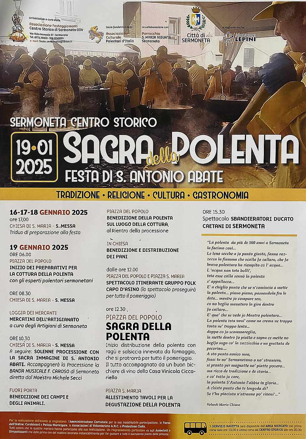 Sarà riproposta l’antica ricetta del piatto tipico sermonetano: la polenta verrà preparata nei tipici paioli di rame adagiati sul fuoco a legna.