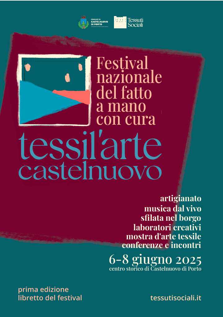 Per tre giorni, Castelnuovo di Porto diventa tela e telaio, luogo vivo e pulsante di bellezza condivisa, esperienze sensoriali, creatività diffusa. Nel cuore di uno dei Borghi più belli d’Italia nasce Tessil’Arte Castelnuovo, prima edizione del Festival nazionale dedicato alle arti tessili e al “fatto a mano con cura”, organizzato dall’Associazione Tessuti Sociali con la direzione artistica di Andrea Barizza, gode del sostegno del Comune di Castelnuovo di Porto, della BCC Provincia Romana e di numerosi partner territoriali.