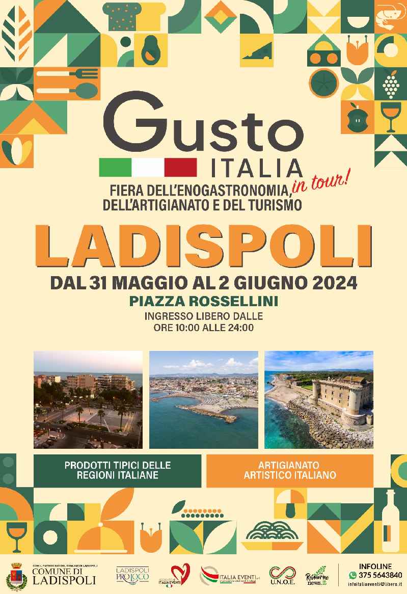 Questa tappa di Gusto Italia è organizzata dall’Associazione Italia Eventi, in collaborazione con la Pro Loco di Ladispoli, con il patrocinio del Comune di Ladispoli, grazie al sindaco Alessandro Grando e all’assessore al Turismo Eventi e Comunicazione Marco Porro, e dell’UNOE Unione Nazionale Organizzatori di Eventi.