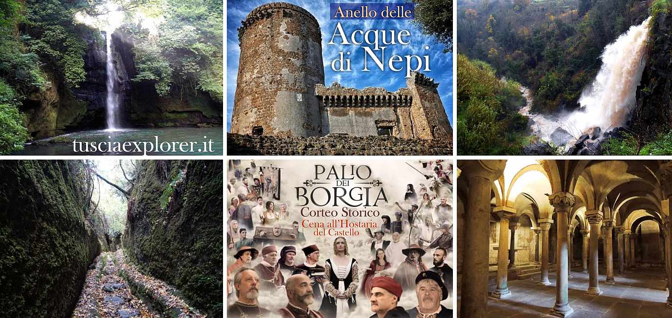 Itinerario per la maggior parte nella frescura del bosco tra sorgenti, fiumi e cascate che circondano Nepi. Rocca dei Borgia (esterno), Vie cave etrusche, Basilica nella "Valle sacra", visita al Duomo e al borgo.