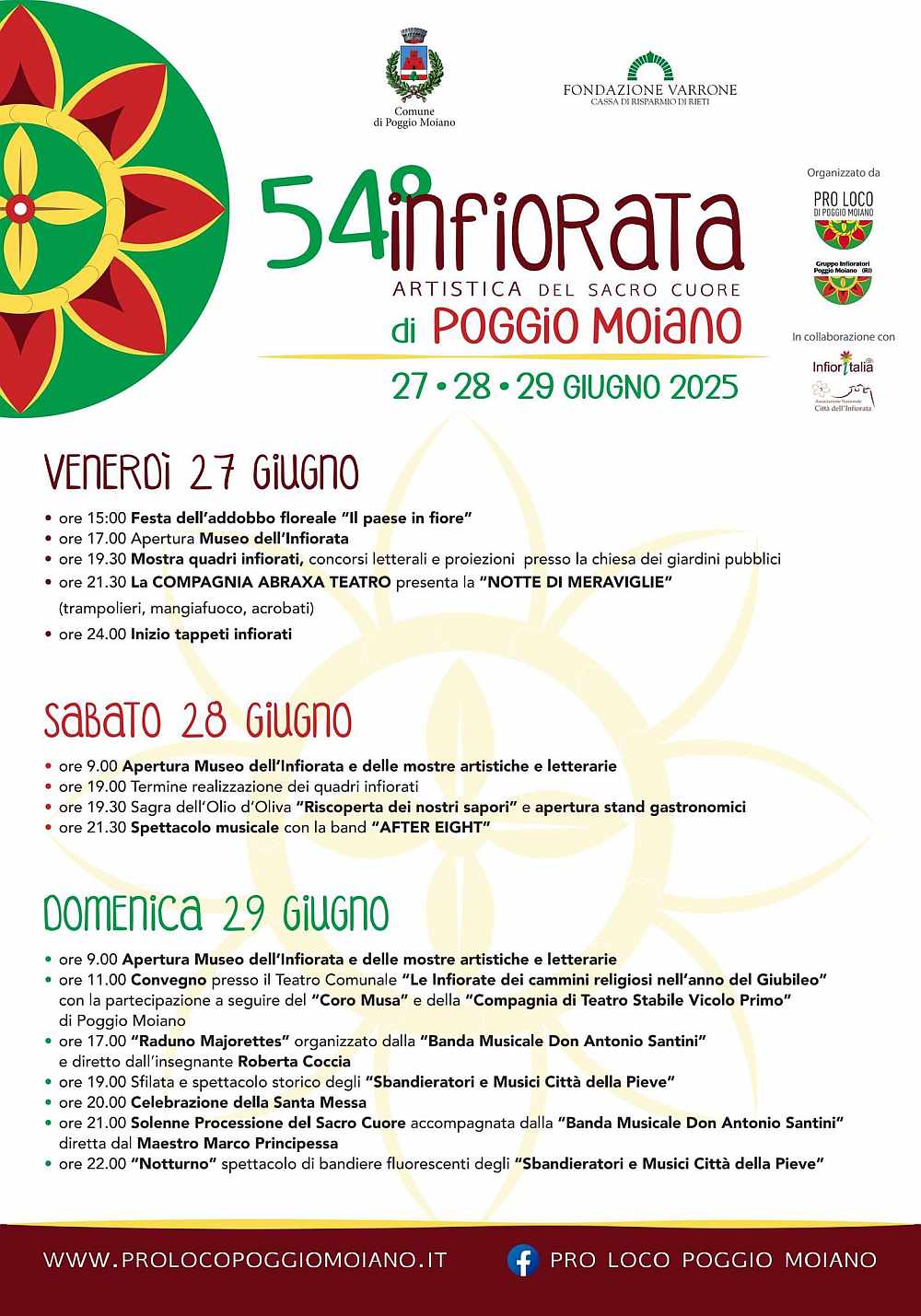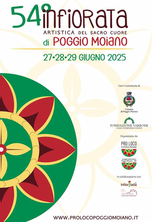Tre giorni di profumi, colori ed emozioni a Poggio Moiano per celebrare l’Infiorata del Sacro Cuore: dal 27 al 29 giugno, tra mostre, spettacoli, musei a cielo aperto e tappeti floreali, il borgo sabino si trasforma in un palcoscenico di arte e tradizione. Dalla “Notte di meraviglie” con acrobati e mangiafuoco alla sfilata degli sbandieratori, passando per la sagra dell’olio d’oliva e la suggestiva processione, il programma intreccia sacro e spettacolo, tra bellezza, fede e memoria collettiva. Un’occasione unica per vivere la magia di un paese che sboccia… fiore dopo fiore..