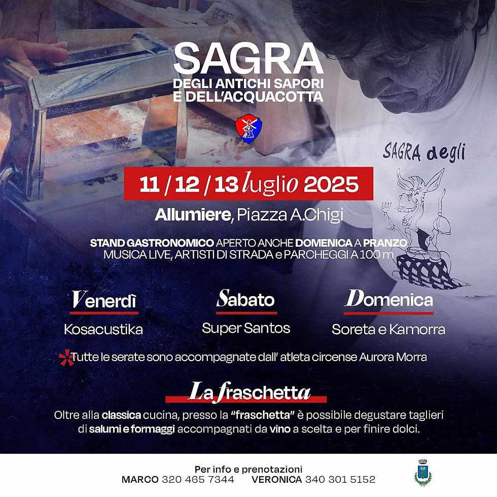La Sagra degli Antichi Sapori e dell'Acquacotta nasce nel 2004 dall'idea della Contrada Polveriera di riscoprire i valori della tradizione allumierasca attraverso i suoi prodotti ed i suoi piatti tipici, con l'acquacotta a fare giustamente da regina.
