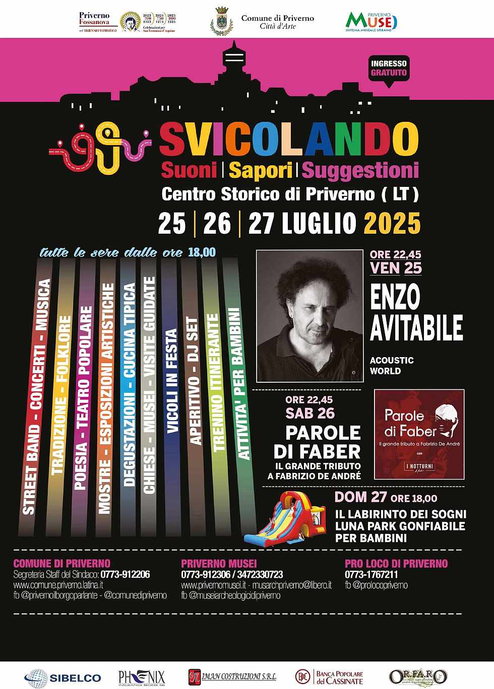 Svicolando è un festival che inizia alle 18:00, offrendo l’opportunità di proseguire la serata nel modo che si preferisce , cenando comodamente nei ristoranti del centro storico, degustando nei vicoli e nelle aree food allestite per l’occasione in Piazza Santa Chiara e al Belvedere alle Mura.