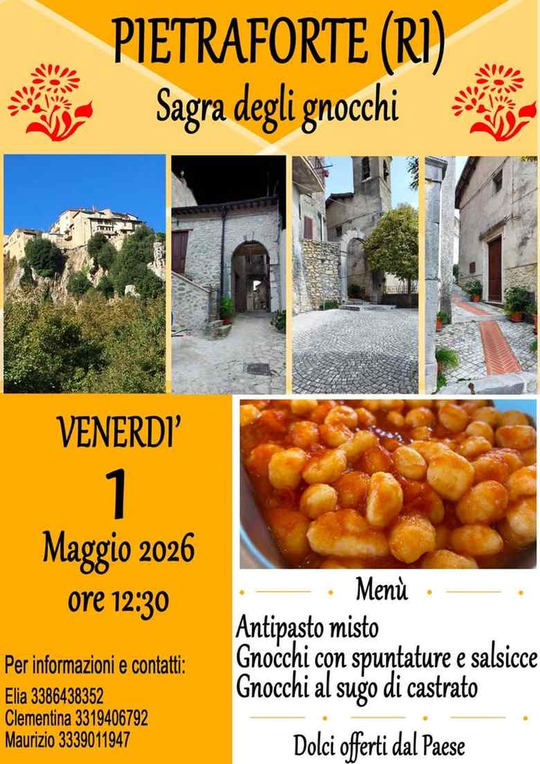 La Sagra degli Gnocchi di Pietraforte è un appuntamento storico della Sabina che celebra i sapori genuini di una volta. Il 1° Maggio, il piccolo borgo si anima per offrire ai visitatori un'esperienza conviviale e autentica.