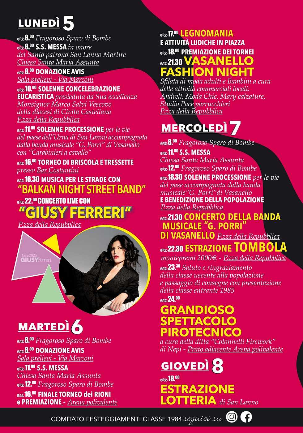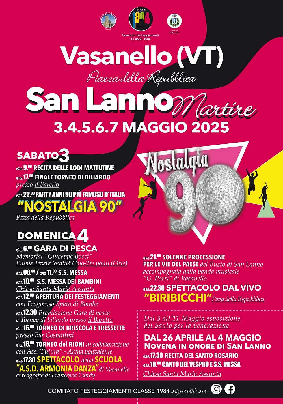 Dal 3 al 7 maggio 2025, Vasanello (VT) si prepara a celebrare il patrono San Lanno con una serie di eventi che uniranno tradizione, musica e spettacolo, organizzati dal Comitato Festeggiamenti Classe 1984.
