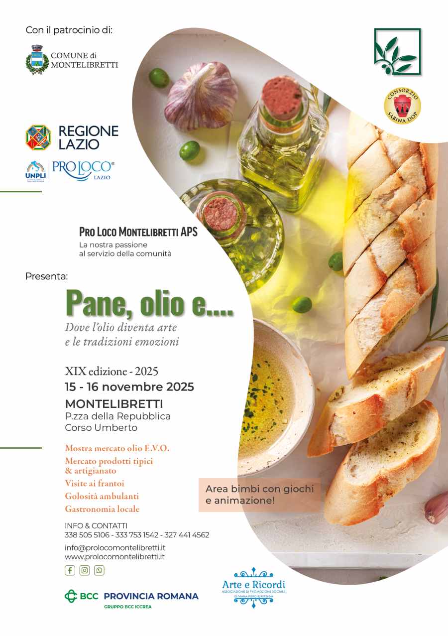 Torna a Montelibretti l’appuntamento con: “Pane, Olio e…” XIX edizione, due giornate dedicate all’olio extravergine d’oliva e ai sapori autentici della Sabina Romana.