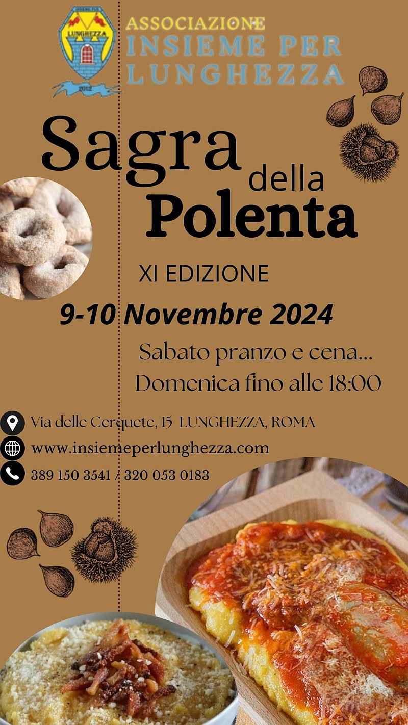 Siamo pronti per annunciarvi le date dell'XI edizione della "Sagra della polenta" di Lunghezza, quest'anno si terrà il 9 e il 10 novembre presso la parrocchia SS. Trinità in via delle Cerquete (RM).