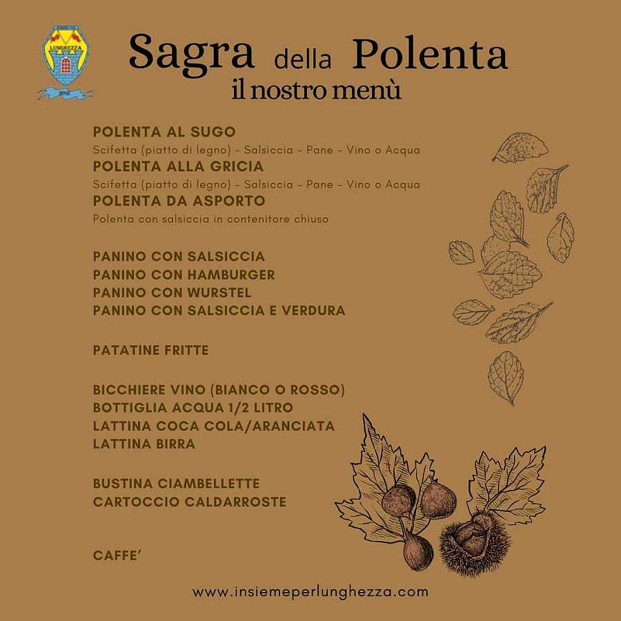 Oltre la polenta servita nella tradizionale scifetta di legno al sugo con salsiccia e alla gricia sempre con salsiccia, potete trovare panini assortiti, patatine fritte, bibite, caldarroste e ciambelline al vino preparate dalle signore dell'Associazione Insieme per Lunghezza.