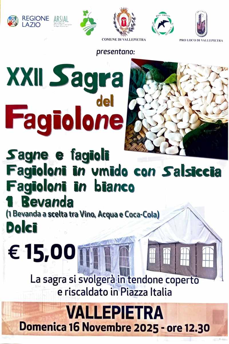 La sagra, giunta alla sua XXII edizione, celebra il rinomato Fagiolone di Vallepietra, un fagiolo bianco di grandi dimensioni, morbido e delicato, Presidio Slow Food.